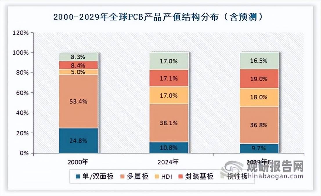 随着印制电路板(PCB)不断向高密度集成与高性能化方向发展,全球PCB产品结构也正在经历深刻变革。数据显示,在2000-2024年全球PCB产品结构中,传统单/双面板占比明显下滑,从24.8%下降到了10.8%;HDI板、封装基板、挠性板占比大幅上升,分别从5%、8.4%、8.3%提升至17%、17.1%、17%;多层板虽然源于4-6层等低端多层板产品的结构性调整,整体占比从53.4%降至38.1%,但仍占据主导地位。预计到2029年,这一结构性调整趋势仍将持续,多层板凭借技术优势与市场惯性,将继续占据全球PCB市场主导地位。